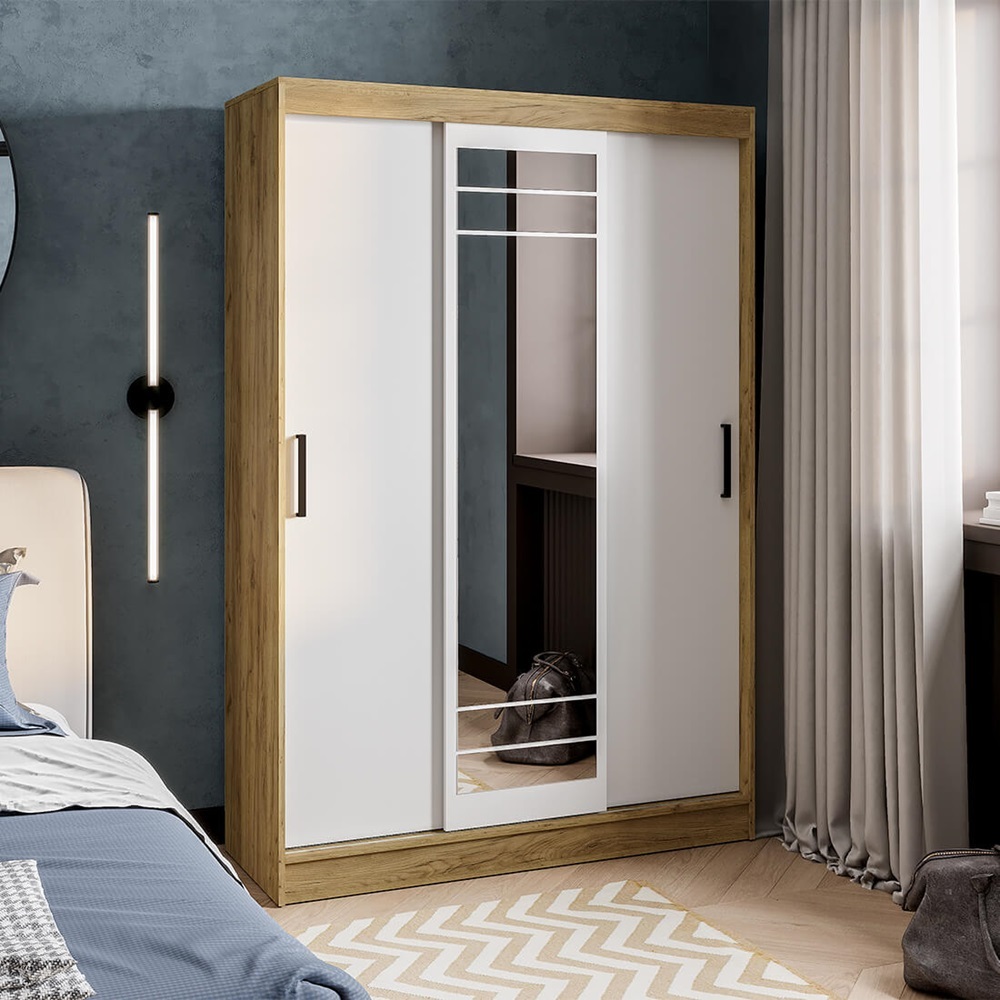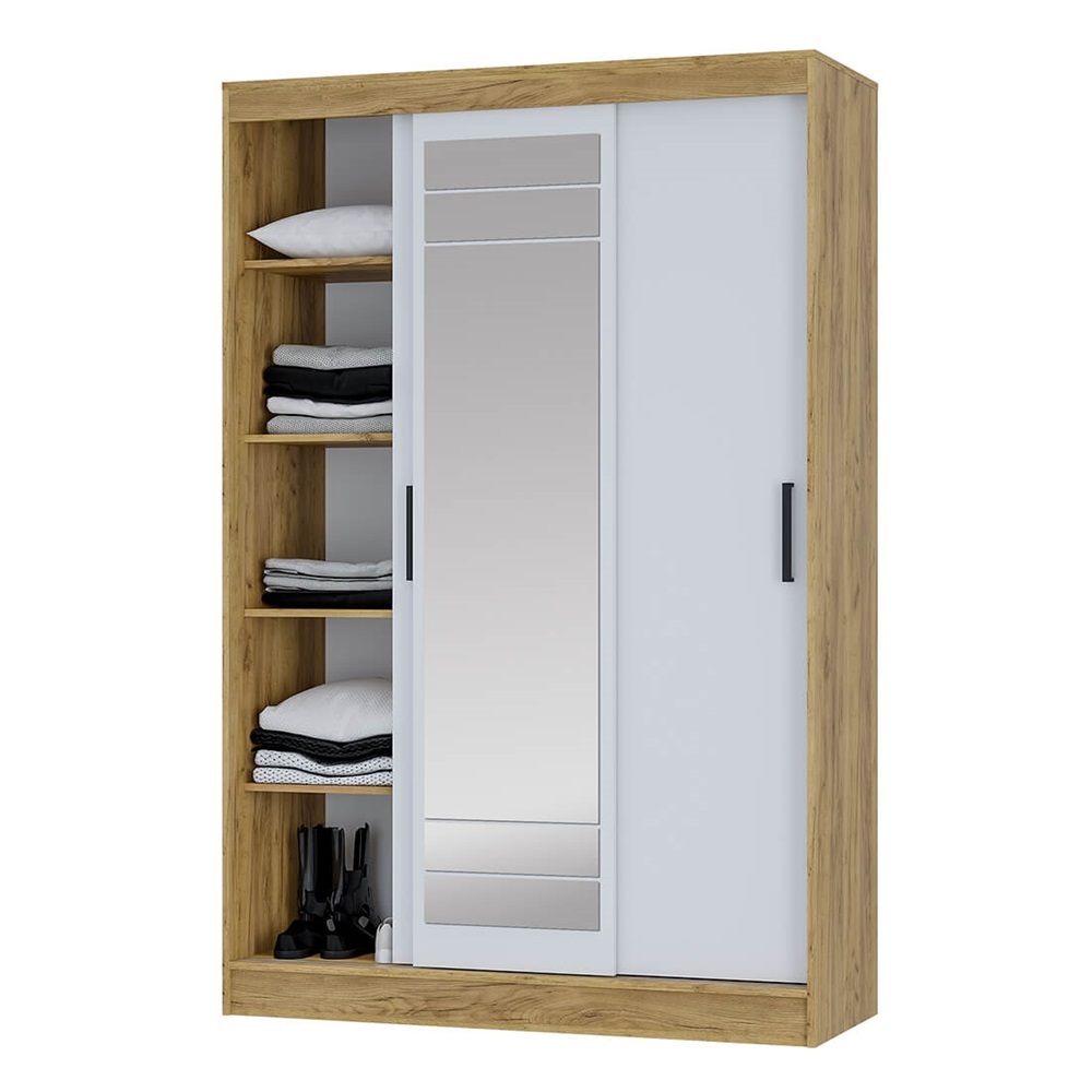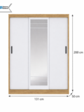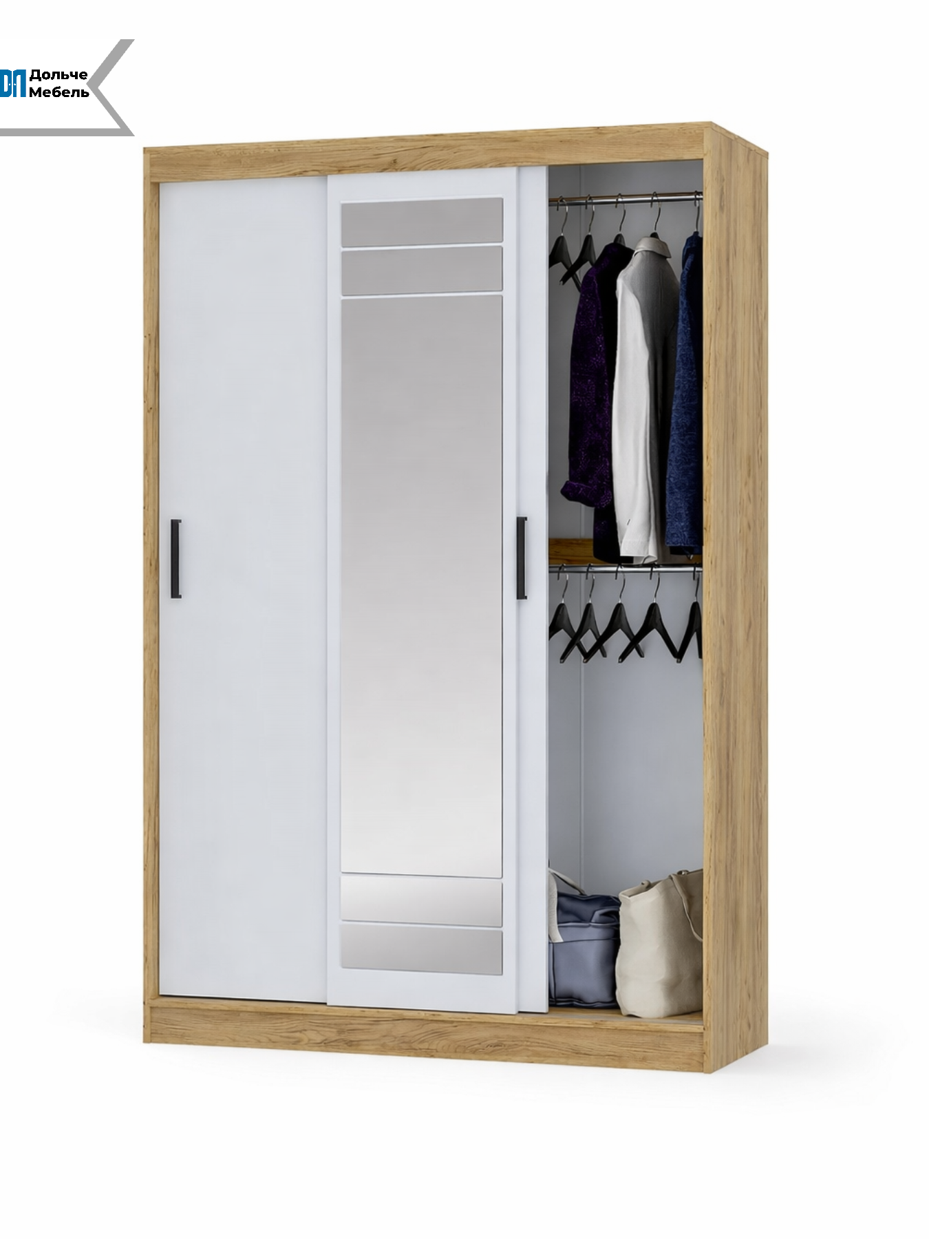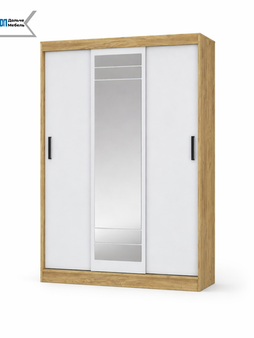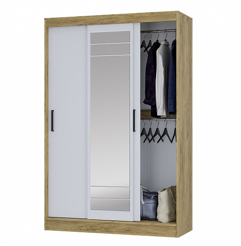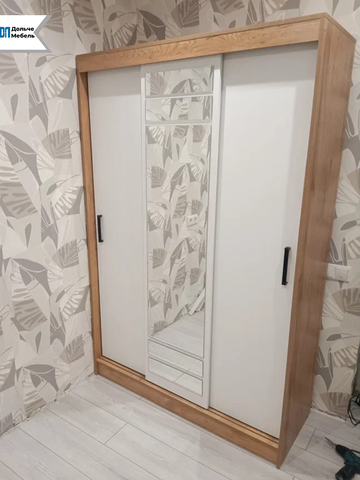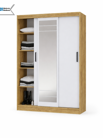 Модель оснащена раздвижными дверями, одна из которых выполнена с зеркалом во весь рост — это удобно для ежедневного использования и визуально увеличивает пространство. Внутреннее наполнение обеспечивает удобную организацию хранения одежды и аксессуаров.