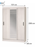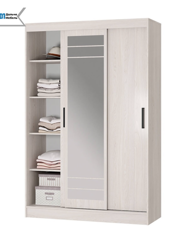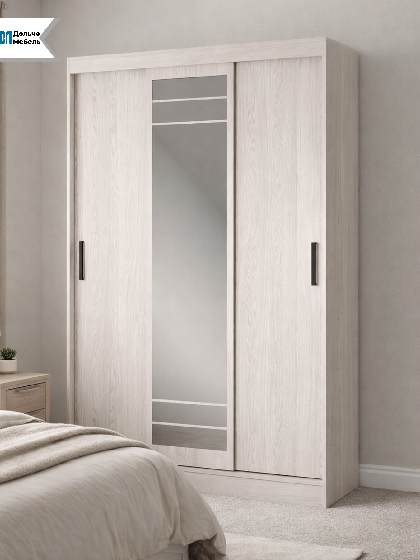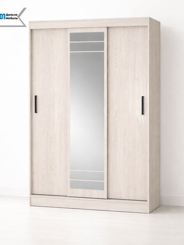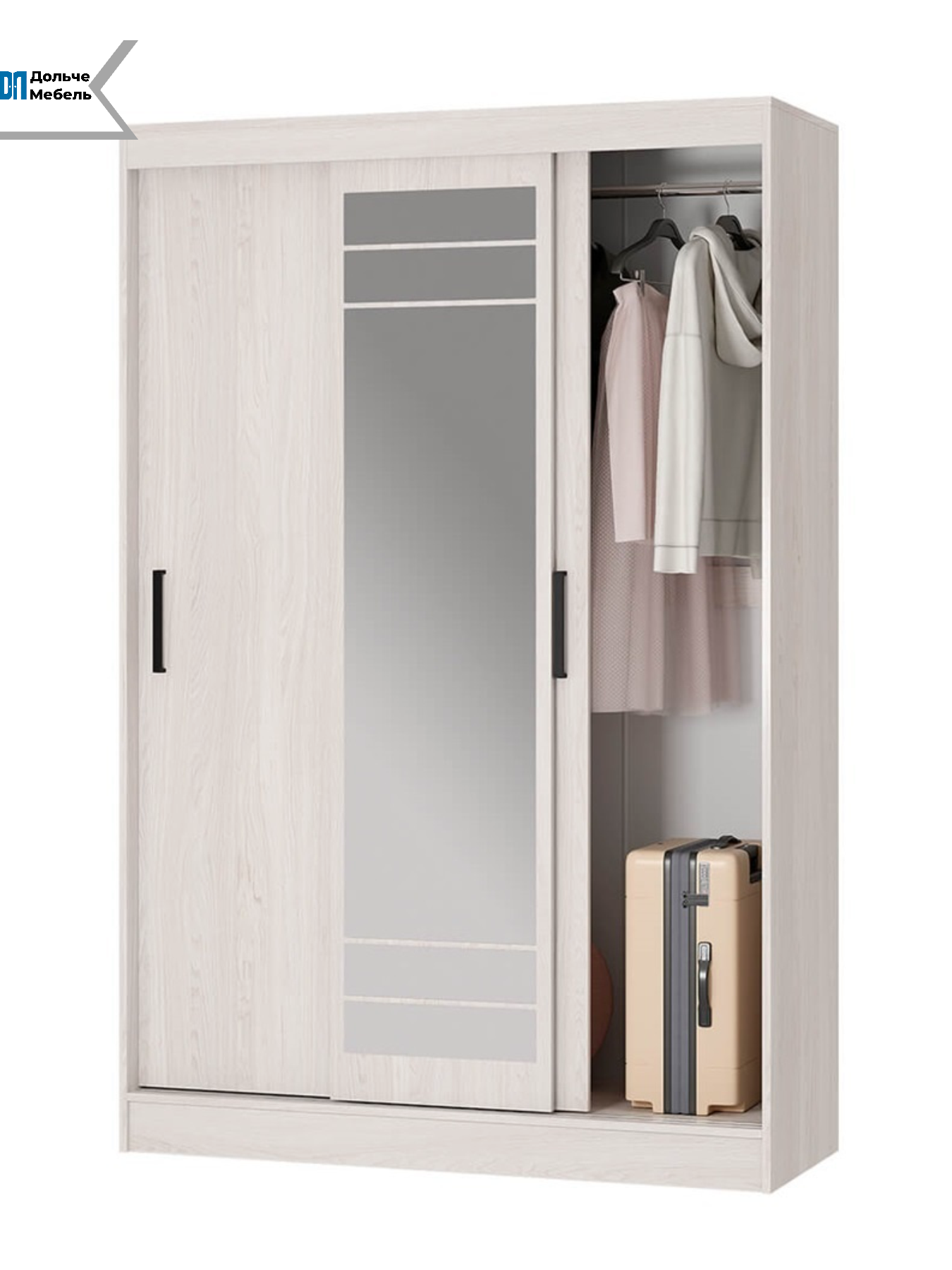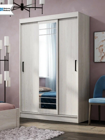 Шкаф-купе оснащен удобными раздвижными дверями, которые обеспечивают легкий доступ к содержимому. Центральная створка оборудована зеркалом с еврокромкой, что визуально расширяет окружающее пространство и добавляет изысканности.