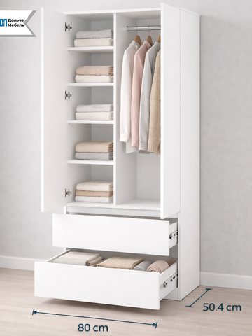 Большое количество полок для вещей в сложенном виде, штанга для деликатной одежды на плечиках и ящики для белья и аксессуаров помогут организовать хранение одежды в одном месте.