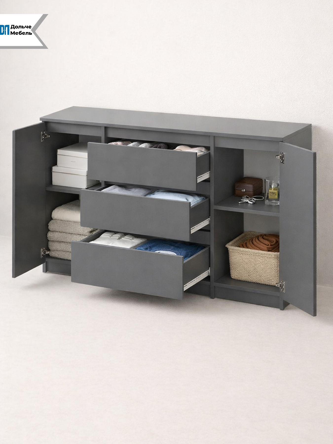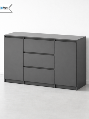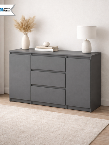 Современный и минималистичный дизайн комода Денвер подойдет для любого интерьера, будь то гостиная, спальня, прихожая или даже под телевизор. Корпус и фасад выполнены из качественного ЛДСП графитового цвета, что придает изделию элегантный и современный вид.